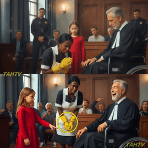 The courtroom was echoing with laughter. Men in suits smirked, their voices sharp with arrogance. A young girl stood trembling, her red dress…