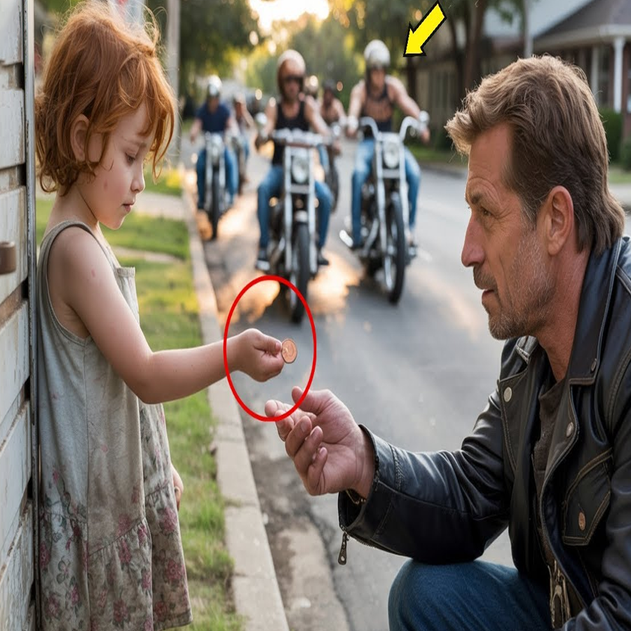 A sick six-year-old approached a biker kneeling on the sidewalk and gently placed her last penny into his outstretched palm while his motorcycle brothers watched from behind. The next morning, this same group of leatherclad riders would completely transform her world in the most unexpected way. But what did this innocent act of kindness unlock in the hearts of these hardened men? The amber light of late afternoon filters through the maple trees lining Elm Street, casting long shadows that dance across the weathered sidewalk, where small chalk drawings from yesterday’s play still cling to the concrete.