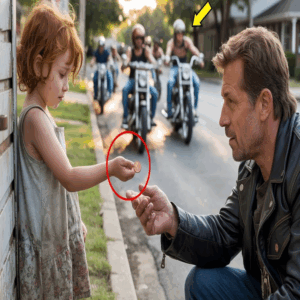 A sick six-year-old approached a biker kneeling on the sidewalk and gently placed her last penny into his outstretched palm while his…